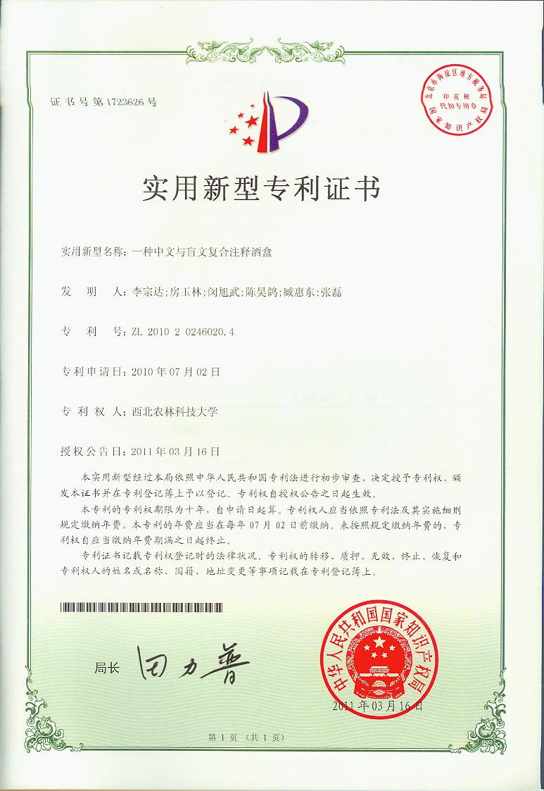 由李宗达、房玉林、闵旭武、陈昊鸽、臧惠东、张磊申请的“一种中文与盲文复合注释酒盒”,专利号为:ZL 2010 2 0246020.4。该专利于2010年7月2日申请,2011年3月16日授权公告。