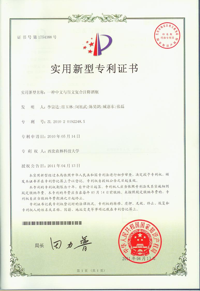 由李宗达、房玉林、闵旭武、陈昊鸽、臧惠东、张磊申请的“一种中文与盲文复合注释酒瓶”,专利号为:ZL 2010 2 0192248.X。该专利于2010年5月14日申请,2011年4月13日授权公告。