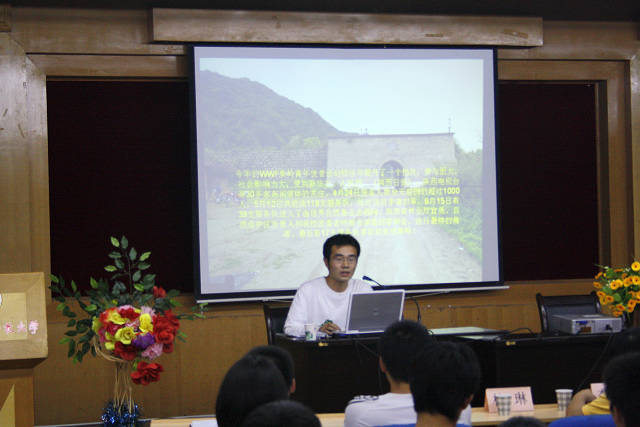 首先由张永斌老师致辞,他向新生们详细介绍了“三下乡”的基本情况和我校在学生社会实践方面取得的诸多成就,表达了对新生们在学好知识的同时做好社会实践活动的期望。接下来校社会实践部部长李腾飞同学做WWF秦岭青年使者活动之老县城行报告。他用丰富翔实的图片、生动诙谐的语言向同学们介绍了秦岭山区的真实情况。并很好的诠释了社会实践活动的意义。