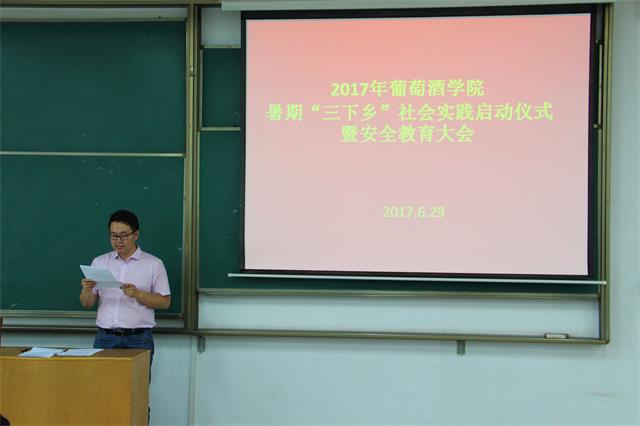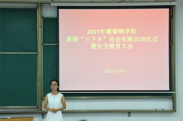 大学生暑期“三下乡”社会实践项目考核暂行规定》,使同学们进一步明确了“三下乡”实践活动的量化考核指标和规范。分管社会实践的学生会副主席李享远带领队员们全文学习了《西北农林科技大学2017年暑期社会实践安全责任书》的全部条款,引导学生树立安全实践意识,确保各项实践活动在安全的前提下顺利开展。校级 “三下乡”社践团队队长靳思雨代表“三下乡”社会实践的全体同学郑重承诺:牢记实践安全,追求实践成效,以良好形象和实际行动展现葡酒学子风采。
