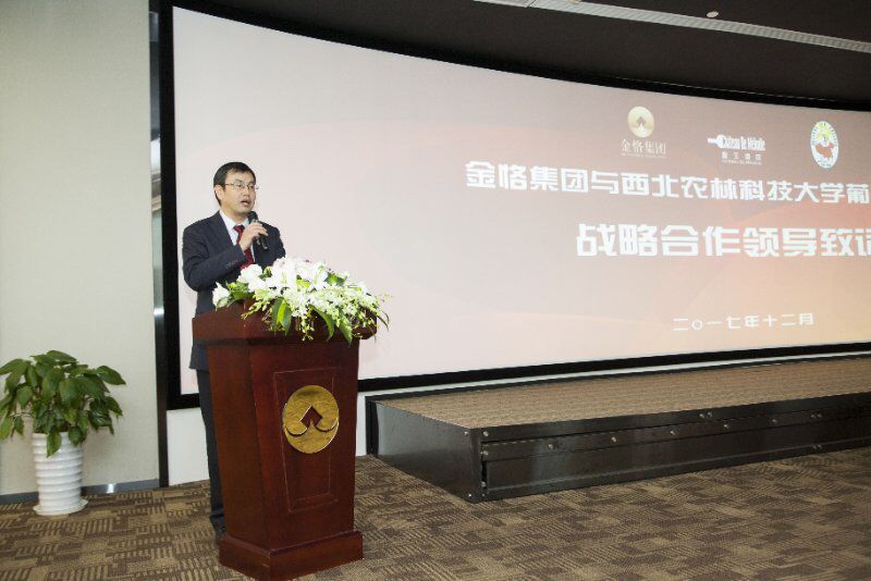 金恪集团董事长王建峰对我校领导、专家的莅临指导表示热烈的欢迎和衷心的感谢,介绍了金恪集团产业战略布局、罄玉酒庄、特色小镇、社会企业创新运营等业态。他表示,集团选择与世界一流的西北农林科技大学合作,强强联手,发挥各自优势,不断探索具有中国特色的酒庄新模式,一定会对中国葡萄酒产业的发展产生深远的影响。