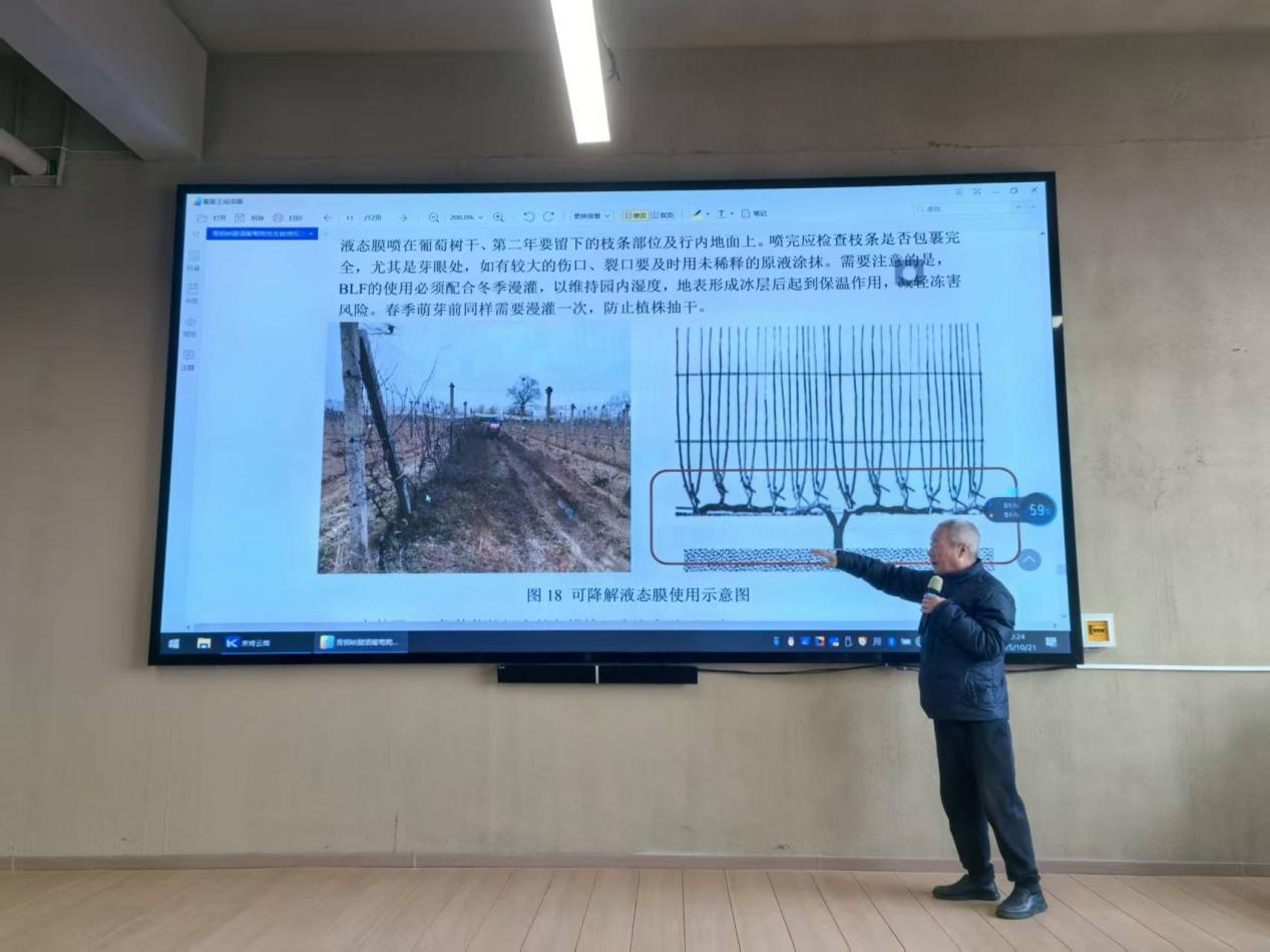 2025 年 10 月 20 日,李华教授抵达此次帮扶行程的第一站 —— 宁夏吴忠,将工作重心首先放在葡萄酒产业的 “源头”—— 葡萄种植环节。10 月 21 日上午,他在西班酒庄牵头举办酿酒葡萄极简化种植模式培训会议,邀请 15 个酒庄的技术骨干、负责人参会。培训中,他结合宁夏当地气候、土壤特点,详细拆解极简化种植模式在降低成本、提高产量、保障品质等方面的技术细节,还现场解答参会人员提出的 “极简化种植趋势和优点等问题,为酒庄筑牢种植根基提供专业指导。当天下午,他马不停蹄走进西班酒庄各个生产种植基地,弯腰查看葡萄藤生长状态,用手触摸土壤感受湿度,与基地工人深入交流日常管理细节。